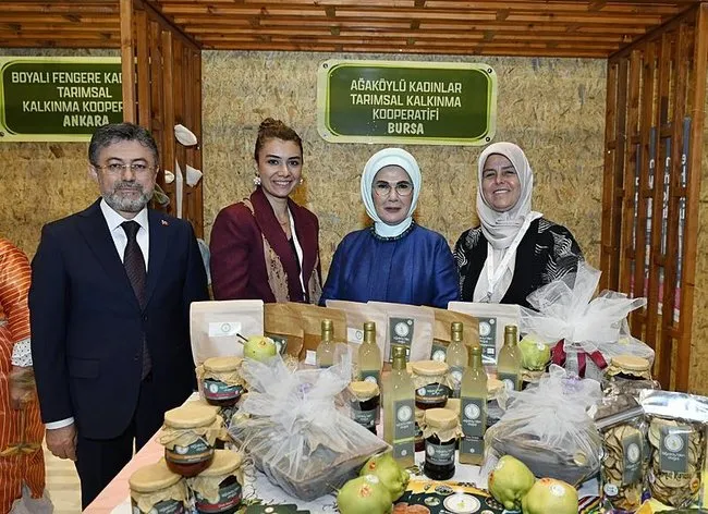 Emine Erdoğan, Bakan Yumaklı ile 15 Ekim Dünya Kadın Çiftçiler Günü dolayısıyla Türkiye’nin çeşitli bölgelerinden 18 kadın kooperatifince fuaye alanında açılan stantları gezdi. Fuaye alanında kadın çiftçilerin, pamuk dallarından yapılan çiçek buketiyle karşılanan Emine Erdoğan, daha sonra stantlarda kadın çiftçilerin AB Tescilli Coğrafi İşaretli ürünler ile Ankara Sofu kumaşından ürünler başta olmak üzere tarhana, erişte, marmelat, reçel, sabun, kolonya, gül yağı, dokuma ve çeşitli el sanatları ürünlerini tek tek inceledi. Kadın çiftçilerden kooperatifleri ve ürettikleri ürünlere ilişkin bilgi alan Emine Erdoğan, başarılarından dolayı tebrik edip, fotoğraf çektirdi.